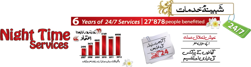 We are extremely grateful to Allah SWT, who made us capable to reach to new horizons at night time also. We discovered that there is a need of providing services to traumatized or for those who may be in need of oxygen cylinder or emergency facilities and they had to wait till morning therefore in 2007 we extended our services to 24/7.